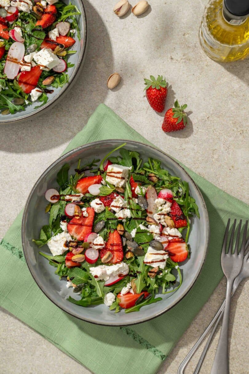 Les fraises s’utilisent très facilement dans des recettes salées même pour les non adeptes du sucré/salé. La preuve avec cette recette de salade roquette, fraises et feta. Une salade rapide à réaliser, croquante et savoureuse. Si vous aimez ce genre de salades, je vous en propose d’autres en fin d’article.